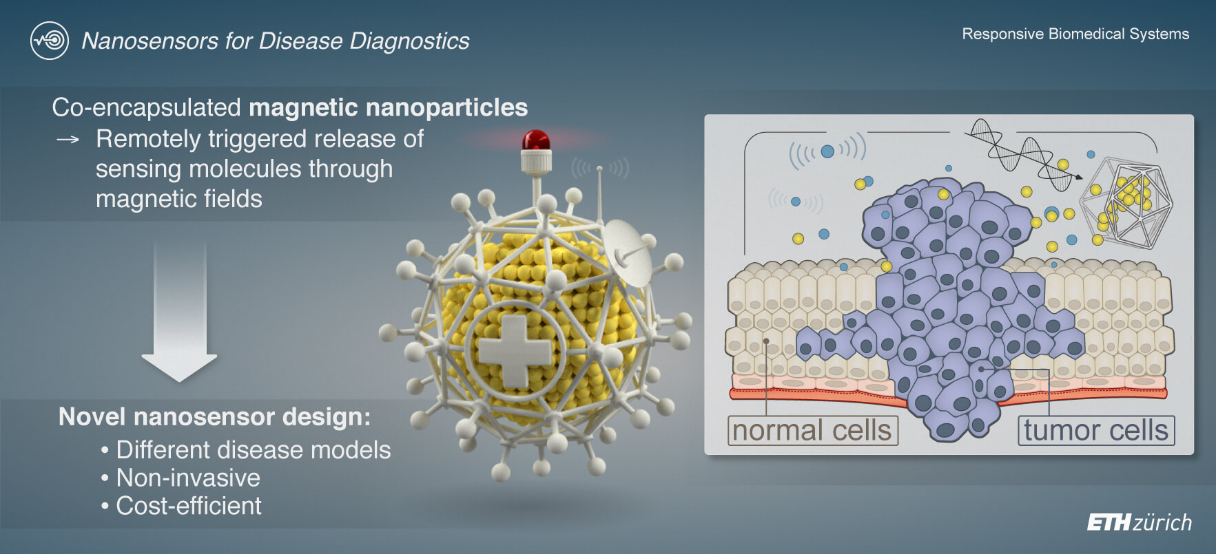 At RBSL, we continue to explore the potential of these and other concepts to develop micro- and nanosensors and mechanisms to control them and communicate diagnostic signals in a non-invasive and cost-efficient manner. For instance, we are designing protease-responsive ultrasound contrast agents (PRUCAs) that can report protease activity through a change in the nonlinear backscattering signal of incoming acoustic waves. Our goal is to assess local protease activity by administering PRUCAs to patients and applying an ultrasound probe to a body area of interest. Additionally, we are developing nanosensors that detect protease activity, coupled with magnetic detection mechanisms, for in vivo use or as convenient benchtop readout systems.